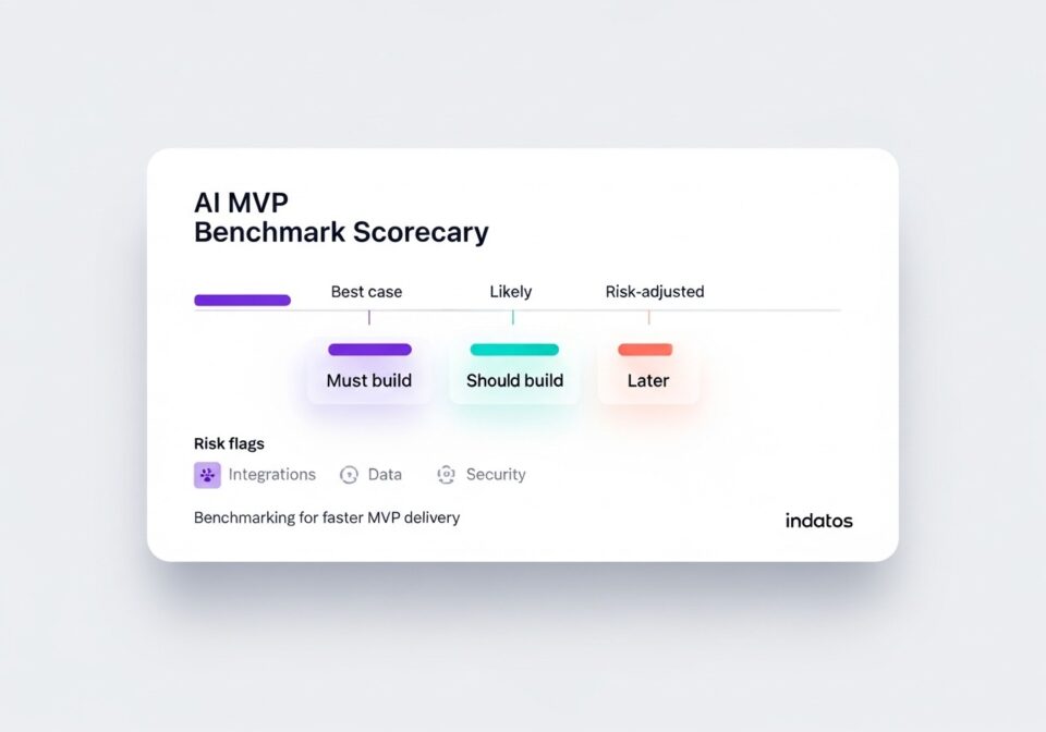 The Indatos AI benchmarking workflow is a lightweight process that translates product intent into a build plan. It combines AI-assisted mapping of features and workflows with human validation to ensure the output is practical and delivery-ready. Instead of relying on generic estimates, the approach identifies complexity drivers that commonly slow MVP development, including authentication and roles, payments, data modeling, third-party integrations, admin tooling, notifications, audit logging, and reporting. The result is a clearer view of what the MVP includes, how the scope should be prioritized, and what it will take to ship.